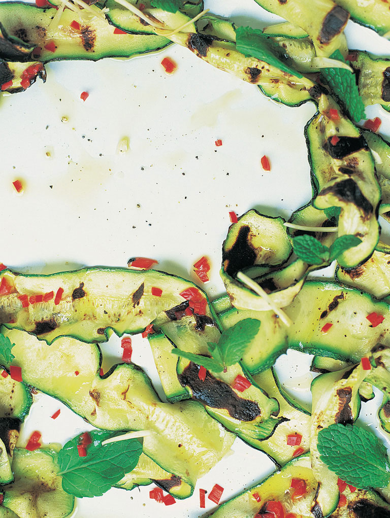 Slice 4 courgettes lengthways as thin as you can (use a mandolin if you have one). Grill on a red-hot griddle pan, or on the barbecue, until lightly charred on each side. Scatter the slices over a large plate, making sure you don't sit them on top of each other otherwise they'll steam and go a bit limp, and there's nothing worse than limp courgettes, I can tell you. While they're still warmish, sprinkle them with a little sea salt and freshly ground black pepper.